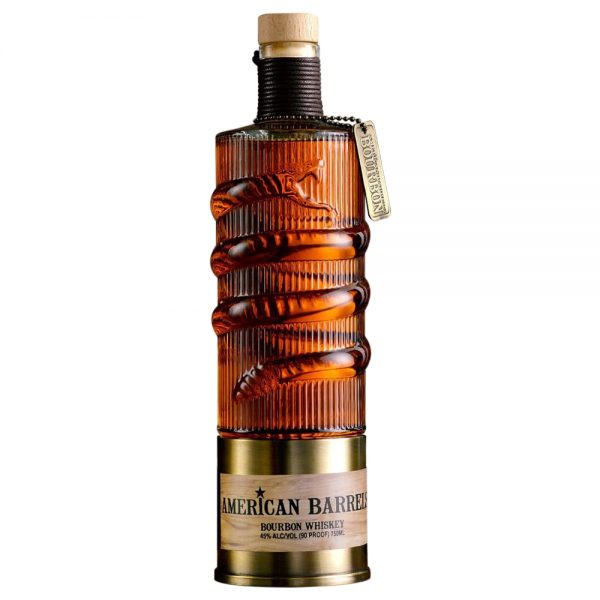 American Barrels is headquartered in Fort Myers, Florida and their flagship is a 90-proof whiskey distilled and bottled in Charleston, South Carolina. After aging, this young bourbon is filtered using a proprietary “post-barrel ultrasonic refinement process.” Holding the liquid is a custom designed bottle that features a brass shotgun shell at its base with a rattlesnake wrapped around it.